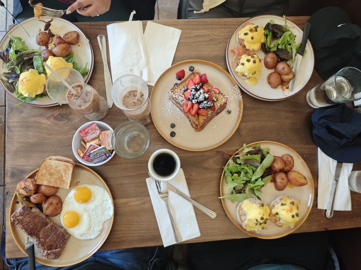 Lovely lively ambiance bustling with locals and tourists. Went around 9am on Sunday, waited for 25min and were seated. Place is small yet menu seems to have something for everyone. We got vegi Benedict and blueberry creamcheese French toast. Both were delicious! However the poached eggs were well done, it was more like hard boiled which was a disappointment. And the salad that came with the Benedict was not fresh. Otherwise, it was a great dining experience!